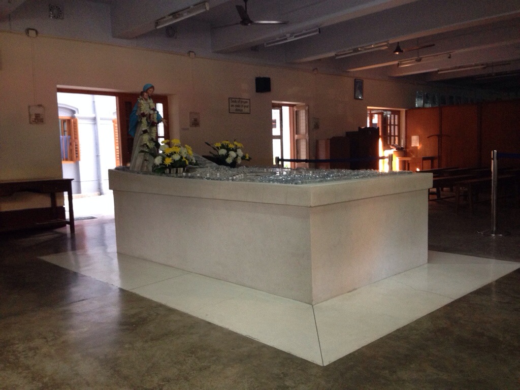 Mas foi sem saber de tudo isso que cheguei à casa. Também não sabia que ainda faltava meia hora para o horário de visitação, e já me preparava para esperar quando uma mulher se aproximou amparando um senhor de muletas, com uma prótese tosca no lugar da perna. Ela sorriu e me chamou para entrar com ela. Foi me levando pelo braço por dentro do convento até uma salinha meio escura, as luzes ainda apagadas. Por algum motivo, fui contemplada com meia hora sozinha junto ao túmulo de Madre Teresa, um dos pontos mais visitados da cidade.