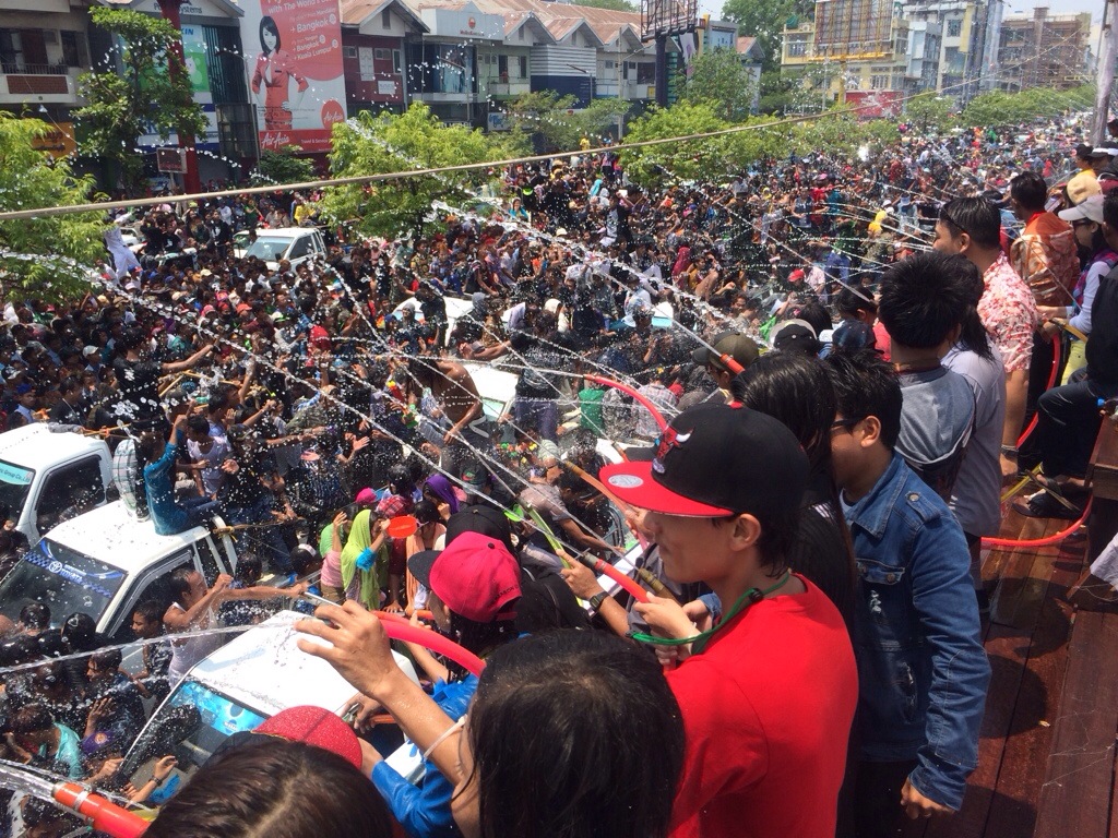 Nas principais cidades, a balada começa por volta das 8h e vai até tarde da noite, com shows e apresentações locais. Exceto por barraquinhas e alguns restaurantes, tudo fecha durante o período, e a única forma de ir a algum lugar é de avião. As ruas ficam tão inundadas que as crianças conseguem nadar na água imunda que se acumula nos espaços entre as sarjetas. Em Mandalay, o enorme canal de onde sai a maior parte do suprimento baixa uns bons centímetros em apenas um dia.