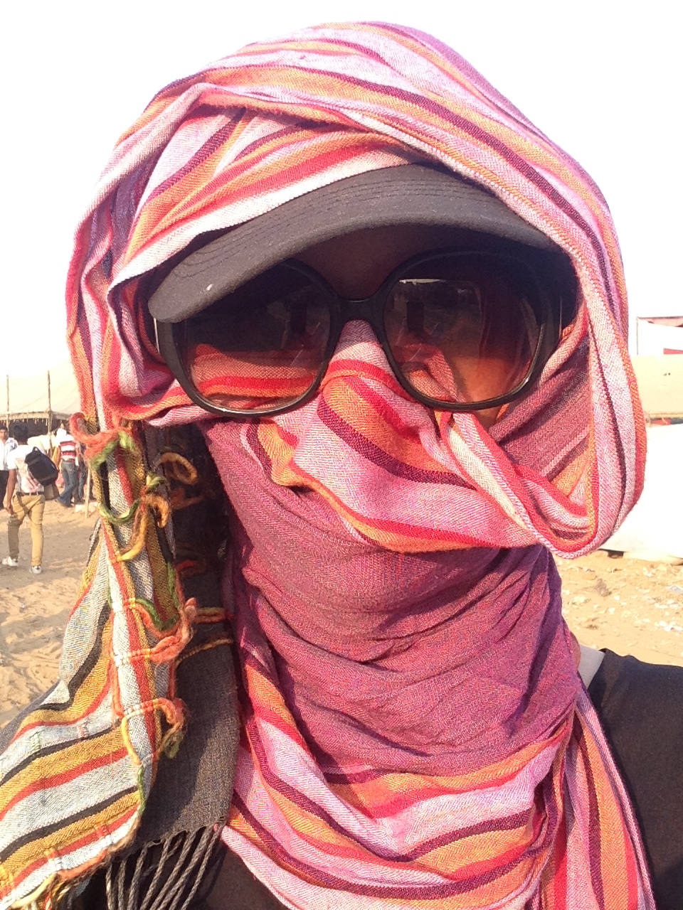 Meu look bisonho na Feira de Camelos de Pushkar, mas o importante é que funciona (tentei sem a echarpe no rosto, só com os óculos e o boné, e automaticamente quatro homens juntaram em volta).